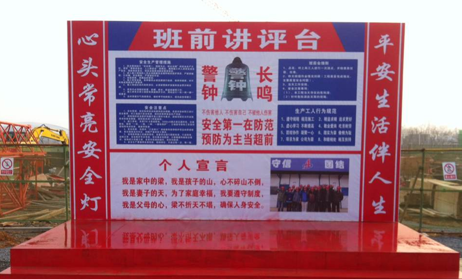 為加強施工安全管理,杜絕重大事故發生,做到文明施工、規范施工、安全施工,日前,通過建立班前施工講評臺制度,每天利用班前10分鐘,由項目管理人員及各班組長對作業人員根據當日的生產情況在講評臺前提出安全要求及所需注意事項,以確保做到安全生產。據悉,龍溪山莊項目部安全目標為創市級文明工地,爭創省級文明工地。